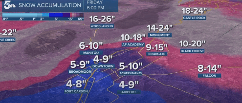 Anticipate a dynamic weather pattern unfolding over the next few days in Colorado Springs. The forecast indicates a mix of rain and snow today, with the possibility of lightning during the day. Precipitation is expected to transition into snow, persisting overnight and intensifying into heavy snowfall on Thursday. Snow totals vary. Image shows accumulation predictions over the 3 days.