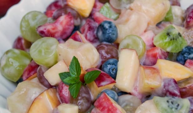 A big bowl of fruit salad makes a healthy snack and is a great addition to any get together that involves food. The easy yogurt glaze using Wallaby Organic Aussie Style yogurt (since it was a sponsor of this recipe, we assume you can use any organic Greek yogurt) was a tasty addition to this healthy fruit salad recipe!