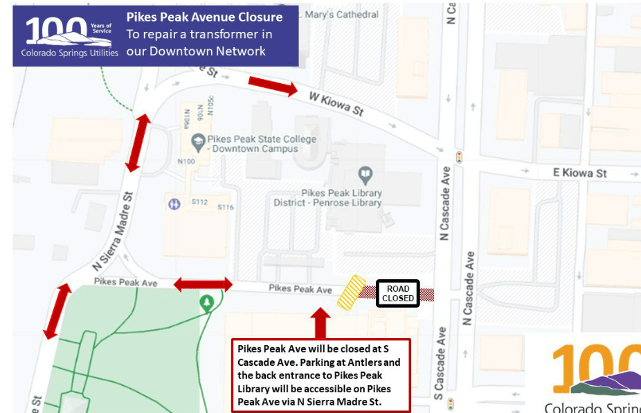 Pikes Peak Ave, Downtown, will be closed at N. Cascade from 7:00 pm tonight to 5:00 am June 6, for transformer maintenance. Access to Downtown buildings can be obtained from N. Sierra Madre. Please follow posted signs and cones for safety.