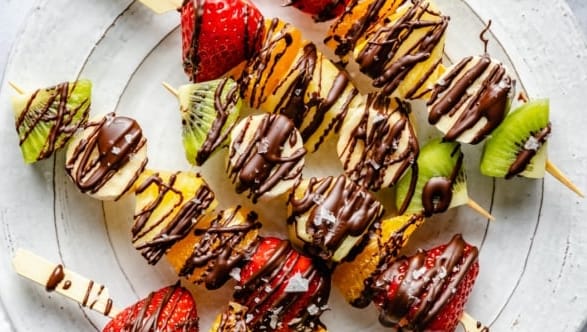 Easy & delicious fruit skewers made with 5 different types of fresh fruit and a drizzle of dark chocolate for an extra treat. These fun rainbow fruit skewers are the perfect healthy snack or dessert, gatherings and great for kids too!