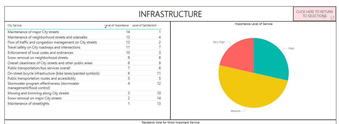 Top priorities for residents included maintaining major streets, preventing crime, enhancing city parks, and addressing homelessness. On the positive side, residents praised snow removal, the city’s fire protection, its support for the military, and the availability of parks.