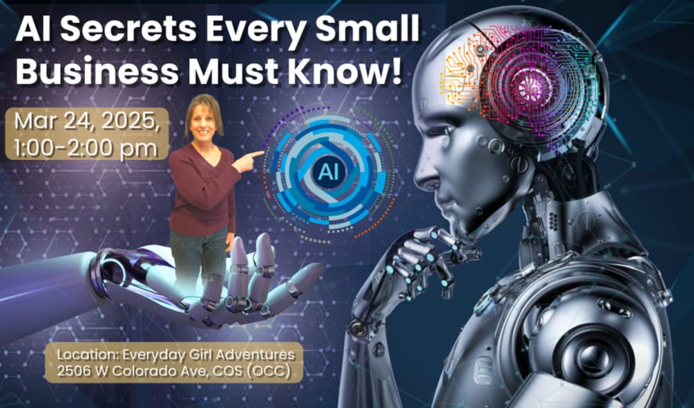 Feeling like there's never enough time in the day? Join me, Sandy Zuniga, this Mon, March 24, 1-2pm at Everyday Girl Adventures in Old Colorado City for a FREE, fun, down-to-earth chat about how AI can help!