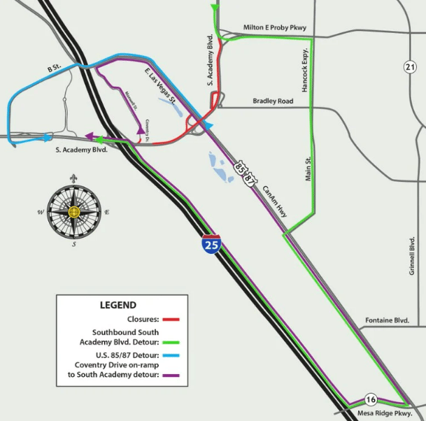 Southbound lanes on S Academy will be temporarily closed tonight, May 28, from 7pm to 4:30am as crews install overhead signs for the widening project. Drivers will need to follow posted detours through Milton Proby Parkway, Hancock Expressway, Main Street, US 85/87, and I-25.