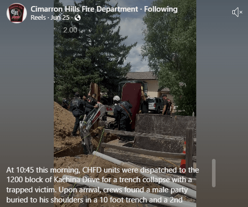 Yesterday emergency crews responded to a trench collapse in Cimarron Hills, where a man was found buried up to his shoulders. The scene required precise teamwork to prevent further danger, as fire crews, utilities, and public safety teams worked together to stabilize the area and safely extract the man. After nearly two hours of careful effort using specialized equipment, he was freed and transported to the hospital. While it's still unclear how the incident began, the outcome reflects just how critical community partnerships can be during life-threatening emergencies.