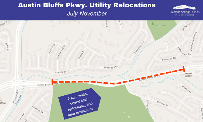 Colorado Springs Utilities has launched a multi-month infrastructure project along Austin Bluffs to relocate key underground systems, paving the way for a future electric substation. As part of this work, expect lane closures and shifts now through mid-November. Westbound traffic is reduced to one lane from Meadowland Blvd to Brenner Pl until late July, while eastbound drivers will encounter varying lane closures from the Union merge-lane to Goldenrod Dr.