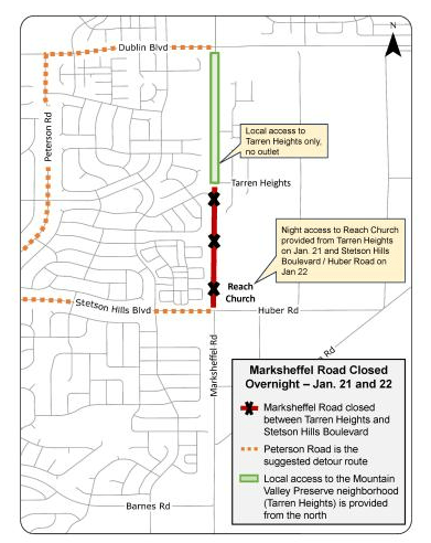 Marksheffel Road, between south of Tarren Heights and north of Stetson Hills Blvd, will close overnight tonight and Thurs evening for drainage work, shutting down at 7pm and reopening by 5:30am each morning. During the day on Thurs and Fri, steel plates will temporarily cover pipe crossings, and on Friday from 9am to 3pm, drivers should expect alternating one-lane traffic with flaggers while crews finish paving. A signed detour will route traffic via Peterson Rd, Dublin Blvd, and Stetson Hills Blvd, while Tarren Heights remains local access only. Some overnight construction noise is expected, and schedules may shift depending on weather.