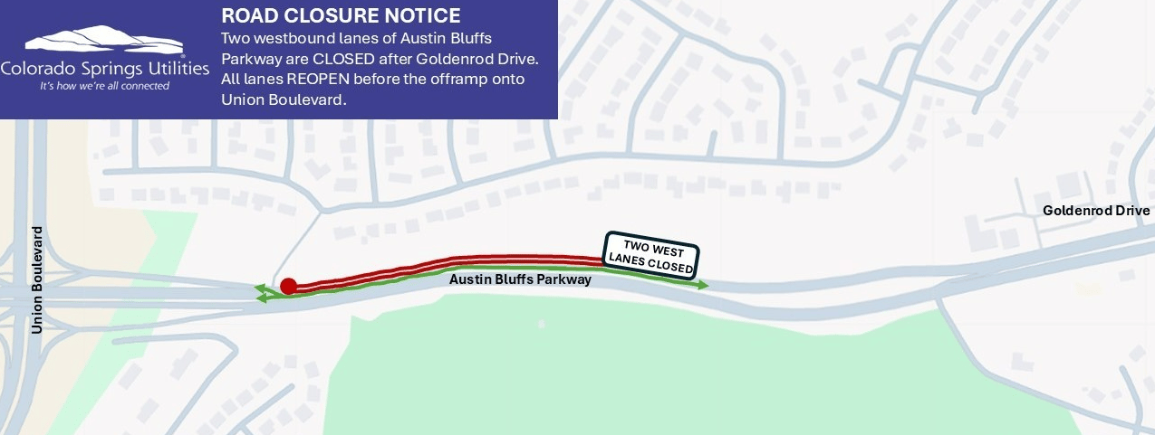 According to Colorado Springs Utilities, two westbound lanes on Austin Bluffs, between Goldenrod Dr and the Union off-ramp, will be closed as electric crews relocate underground cable for the Central Bluffs Substation project. The work will start today and is expected to wrap up and lanes reopen by Feb 19, but drivers should plan for slower travel during this window. You may want to avoid this area until it reopens.